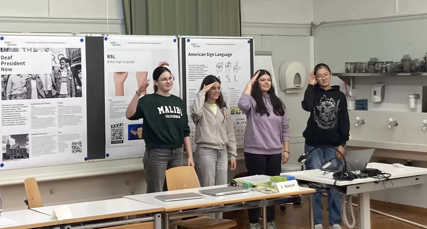 In der Projektwoche «Einführung in die Gebärdensprache» lernten wir erste Gebärden in der Deutschschweizer Gebärdensprache (DSGS) und beschäftigten uns mit der Grammatik der DSGS sowie mit anderen Gebärdensprachen und weiteren Themen mit Bezug zur Gehörlosenkultur. Zudem besuchte und unterrichtete uns eine gehörlose Gebärdensprachlehrerin und wir waren an einer Führung im Gehörlosenzentrum in Zürich-Oerlikon.